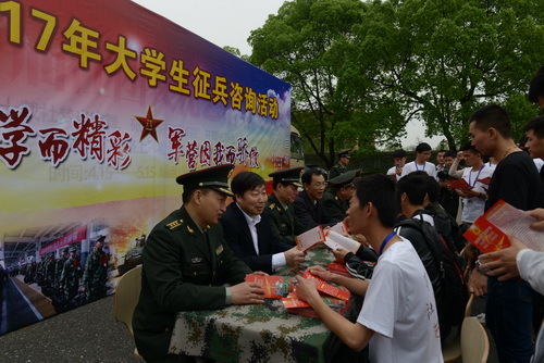 当天,大学生征兵宣传月活动也正式在我校拉开帷幕,杨丹、林德明、虞方、陈任保、吕玉华等来到位于校门口的征兵政策咨询点前,为在校大学生解读和宣讲有关征兵政策。征兵宣传活动极大地激发了大学生参军报国的热情,咨询点前,大学生络绎不绝的前来咨询入伍参军的相关事宜。各位领导逐一耐心作答,他们向大学生宣讲了军队现代化建设对高素质人才的需求、大学生服兵役的法律义务、国家和学校的相关优惠政策,并详细介绍了参军时间安排、入伍条件、服役待遇、退伍补偿等问题,勉励大学生携笔从戎,把个人理想与价值追求融入国防和军队建设事业当中去,建功军营,回报社会。