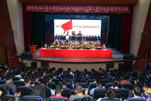 4月15日,我校举行2017年大学生征兵宣传启动仪式暨大学生征兵宣传月活动。吉安市委常委、市政府常务副市长、市征兵领导小组组长杨丹,吉安市委常委、军分区政委林德明,吉安军分区副政委虞方,我校党委常委、副校长吕玉华,吉安职业技术学院副校长肖筑清出席了启动仪式,吉安军分区参谋长、市征兵办主任陈任保主持启动仪式,杨丹、吕玉华分别讲话。各县(市、区)分管武装的副县(市、区)长、征兵办主任以及师生代表300余人参加了会议。 杨丹强调,要高度重视大学生征兵工作,大学生入伍是党中央、国务院、中央军委作出的决策,是国防建设的需要,是我军现代化建设的现实需要,也是大学生个人成长进步的需要。希望高校要发挥主阵地作用,加强组织安排,确保向部队输送优质兵源,希望高校要加强宣传动员和服务保障,确保征兵工作从校门到营门的顺畅。希望大学生做争相报效国家的先锋模范,做磨砺成长的优秀代表,做牺牲奉献的优秀代表,做履行义务的优秀代表。