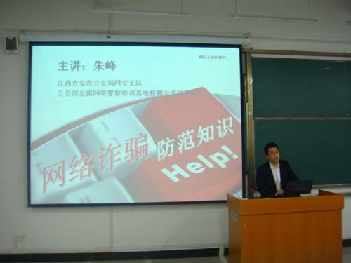 吉安市公安局网络安全支队警官朱峰作主讲,他就什么是网络诈骗、网络诈骗的类型、如何识别诈骗网站、如何防范网络诈骗等方面作了详细的解读、介绍和说明。在讲解中,他不时运用现实生活中的典型案例,客观地剖析了网络诈骗伎俩、网络诈骗陷阱对高校大学生造成的危害性,为我校师生奉送了一份温馨可口的网络安全大餐,师生普遍反映受益匪浅,纷纷表示要在今后学习、生活中不轻易相信网络购物、网络联盟,保障自身合法权益。
