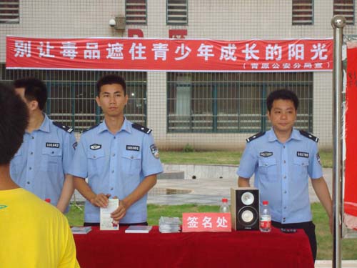 6月26日是国际禁毒日。为使青年学生了解毒品的危害,珍爱生命,远离毒品,禁毒日当日下午,青原区公安局分局在校保卫处配合下,在十栋教学楼一楼大厅开展了“别让毒品遮住青少年成长的阳光”为主题的宣传、教育活动。